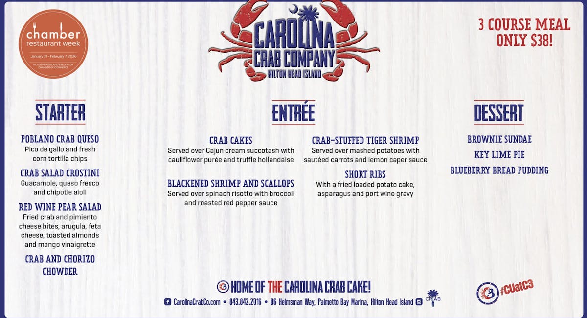 Carolina Crab Company Restaurant Week January 31, 2026 03:00 PM until February 07, 2026 09:00 PM Enjoy Restaurant Week from January 31st-February 7th. Click here to make your reservations