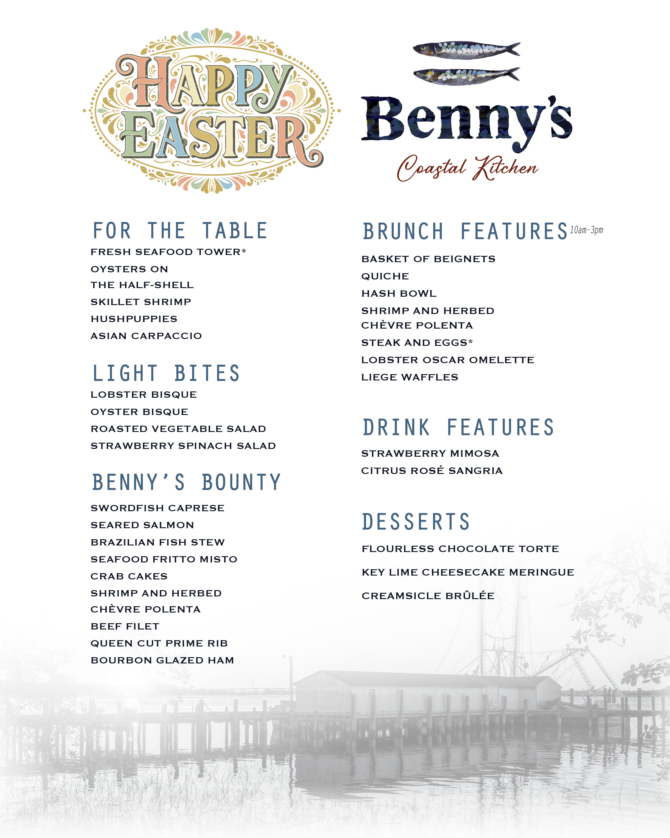 Easter at Benny's Coastal Kitchen April 05, 2026 10:00 AM until April 05, 2026 08:00 PM Benny's will be serving Easter features during brunch & dinner! Click here to make your reservations