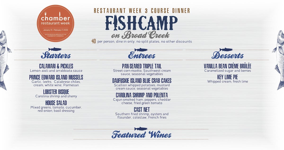 Fishcamp on Broad Creek Restaurant Week January 31, 2026 until February 07, 2026 Enjoy chamber Restaurant Week from January 31st-February 7th. Click here to make your reservations