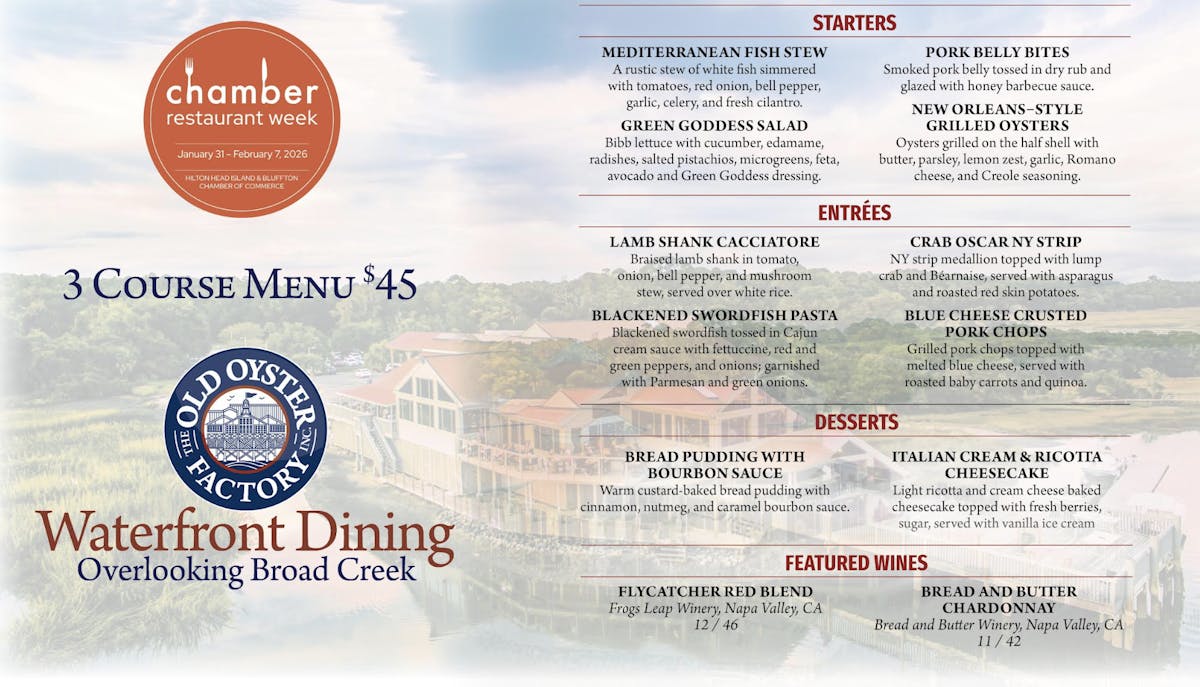 Old Oyster Factory Restaurant Week January 31, 2026 04:00 PM until February 07, 2026 09:00 PM Enjoy Chamber Restaurant Week from January 31st - February 7th. Click here to make your reservations