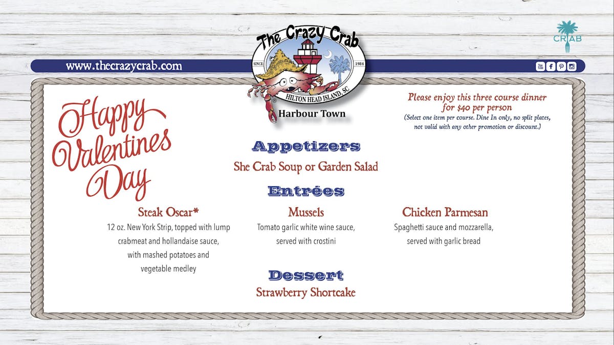 Valentine's at Crazy Crab Jarvis Creek February 14, 2026 until February 14, 2026 09:00 PM Click here to make your Valentine's reservations ❤️
